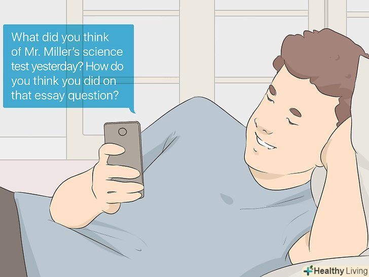 Почніть спілкування зВідкритого питання, щоб спровокувати реакцію.якщо ви задасте просте питання, на який досить відповісти «так» або «ні», то, можливо, співрозмовник відреагує односкладово, тому постарайтеся придумати питання, яке вимагає пояснень. Таким чином, людина буде залучена в розмову з самого початку. В якості бонусу, ви зможете дізнатися трохи більше про нього, виходячи з його відповідей![3]- Спробуйте сказати що-небудь на кшталт: "Що ти думаєш про вчорашній тест Варвари Петрівни? Як думаєш, ти впорався із завданням, де потрібно було написати есе?"(Якщо він скаже, що це було раз плюнути, а вам так не здалося, попросіть допомогти вам з підготовкою до наступного тесту).