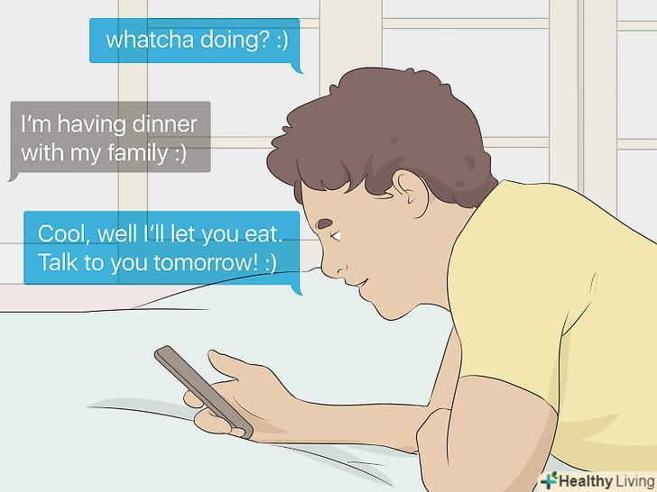 Запитайте предмет обожнювання, чим він займається.як тільки зав'яжеться розмова, поцікавтеся у співрозмовника, чим він займається. Якщо він не зайнятий, продовжите листування-в іншому випадку скажіть, що поговорите пізніше. Таким чином, ви не будете турбувати його, поки він зайнятий. Швидше за все, людина оцінить, що Ви проявили увагу до його часу, що збільшить ймовірність того, що він поспілкується з вами пізніше.- Наприклад, якщо він каже, що вечеряє зі своєю сім'єю, можна сказати: "Круто, тоді не буду вас відволікати. Поговоримо завтра!»