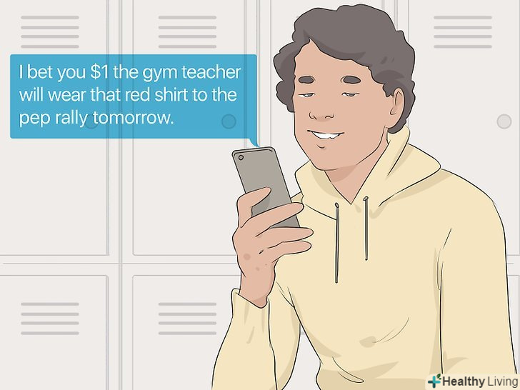 Укладіть парі з предметом обожнювання, щоб показати йому свою сміливу сторону.всім подобаються невеликі дружні змагання, і це буде відмінним способом для вас двох розділити невинну витівку. Киньте йому виклик, дайте завдання або укладіть парі і перевірте, чи готова людина трохи повеселитися![6]- Наприклад, можна сказати: «Тримаю парі на 100 рублів, що вчитель фізкультури одягне ту червону сорочку завтра на збори вболівальників». Головне, не забудьте розплатитися, якщо програєте!