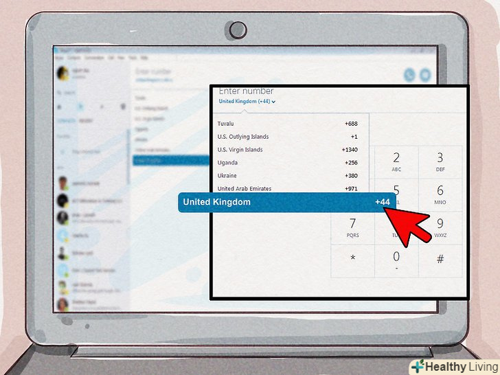 Зателефонуйте до Лондона за допомогою Skype.Авторизуйтесь в Skype і натисніть на значок у вигляді телефонної трубки. На екрані з'явиться панель для набору номера. Також відобразяться тарифи на дзвінки в обрану країну.[13]- У меню виберіть "Великобританія". Це меню розташоване над панеллю для набору номера. Коли ви виберете країну, буде автоматично введений правильний код країни.[14]