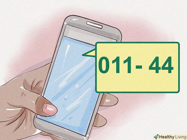 Наберіть 44, щоб зателефонувати в Лондон. 44-це телефонний код Великобританії. У кожної країни свій унікальний телефонний код, що ідентифікує країну, в яку ви телефонуєте.[2]- Не набирайте код країни, якщо телефонуєте в Лондон з Великобританії. Код країни (як і код виходу) використовується тільки для міжнародних дзвінків.