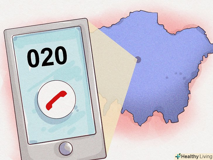 Наберіть 20 після коду країни, якщо телефонуєте на стаціонарний телефон. 020-це код міста (більшої частини Великого Лондона). Британські коди міст складаються з 2-5 цифр (не рахуючи першого 0) і присвоюються згідно географічним регіонам. Такі коди завжди починаються з 0, але нуль набирати не потрібно, якщо ви телефонуєте з-за меж Великобританії.[5]- Наберіть 020, якщо телефонуєте на стаціонарний телефон в Лондоні з Великобританії.