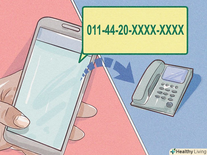 Наберіть номер стаціонарного телефону, коли наберете код міста.наприклад, щоб зателефонувати на стаціонарний телефон в Лондоні з Росії, потрібно набрати: 8-10-44-20-XXXX-XXXX. XXXX-XXXX - це номер стаціонарного телефону, 20 — код міста (Великого Лондона), 44 — код країни (Великобританії), 8-10-код виходу (Росії).[6]- Не забудьте по різницю в часі, коли будете дзвонити в Лондон.взимку в Лондоні діє всесвітній (Грінвічський) час (UTC+0), а влітку — Британський літній час (UTC+1). Враховуйте різницю в часі, щоб не зателефонувати занадто рано або занадто пізно.[7]
