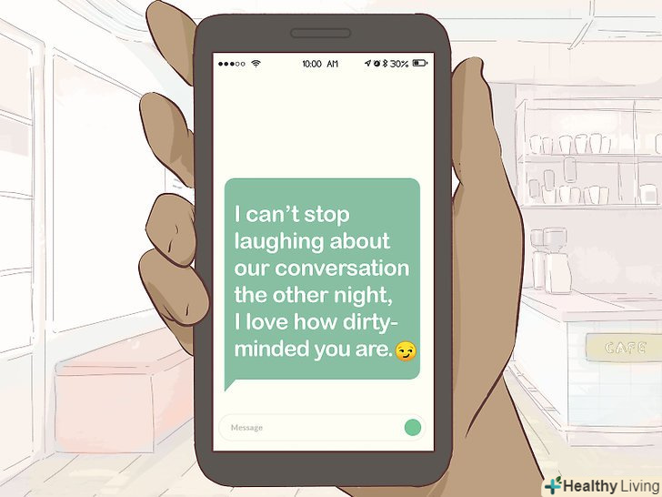НапишітьКомплімент, щоб привернути увагу.компліменти-це відмінний спосіб перейти на новий рівень близькості і почати більш пікантну розмову. При цьому важливо, щоб комплімент був щирим і приємним.[2]- " Привіт, красунчик!"буде чудовим початком, особливо у відносно нових відносинах.