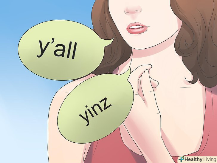 Вивчіть діалектизми регіону, чий акцент ви хочете зобразити.південці кажуть" y'all "замість" you all", використовуючи це скорочення як множинну форму займенника " you."У Пітсбурзі, штат Пенсільванія, говорять" yinz "замість" you "(множинна форма), а в Массачусетсі та інших куточках Нової Англії в ходу слово" wicked", що використовується для вказівки інтенсивності, насиченості дії:" That was a wicked bad car accident "або"That test was wicked easy". Той же Массачусетс знаменитий Бостонським акцентом, який перетворює фразу " Park the car at Harvard Yard and get a cup of coffee "у щось на зразок" Pahk the cah in Hahvehd yahd and get a cup of caffee."
