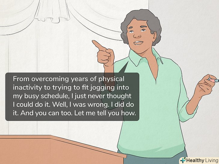 Використовуйте в допомогу помітні картинки. коли маєте намір виступити з промовою про отримання якогось продукту або результату, хвалячись "завершеною роботою" на початку промови, ви можете заінтригувати глядача і змусити захотіти навчитися домогтися такого ж результату.- Для мови про схуднення ви можете почати показувати фотографій людей до використання методу, описуваного вами і після.