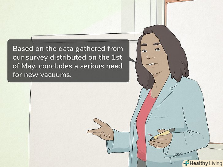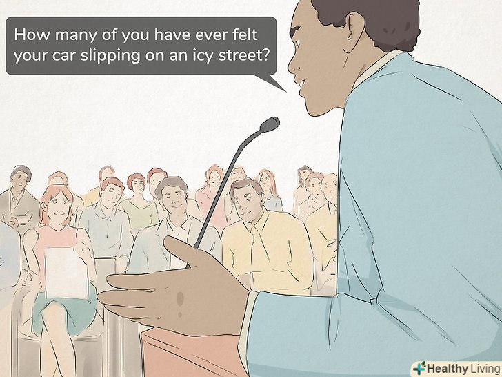 Задайте оглядове питання.запитайте думку глядачів про певне питання, щоб зрозуміти, що вважають ваші глядачі. Це допоможе глядачеві зануритися в матеріал, яким ви ділитеся, і він стане для них істотним.[7]- Для мови про те, як підготувати машину до зими, ви можете запитати у глядачів щось на зразок: "у кого-то коли-небудь машина ковзала по ожеледиці на дорогах? Або хто тут був у ситуації, коли машина глухне на узбіччі дороги під час суворих заморозків? "