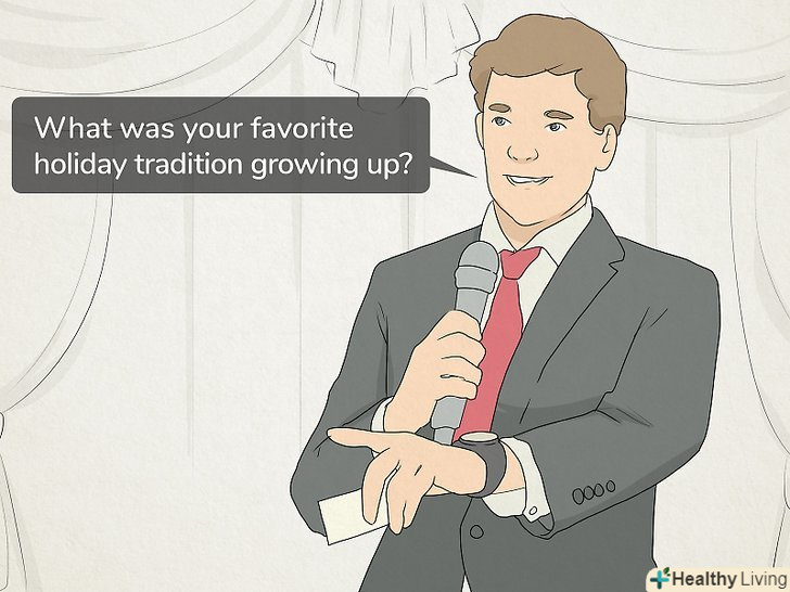 Задайте риторичне запитання.запитайте у глядачів питання по вашій темі, і ви моментально привернете їх до неї. Люди в залі для глядачів почують питання і почнуть думати над власною відповіддю, за допомогою цього вони увіллються в тему мови.- Якщо ваш виступ про традиції і свята, то можете запитати: "яким був ваш улюблений свято в дитинстві? "