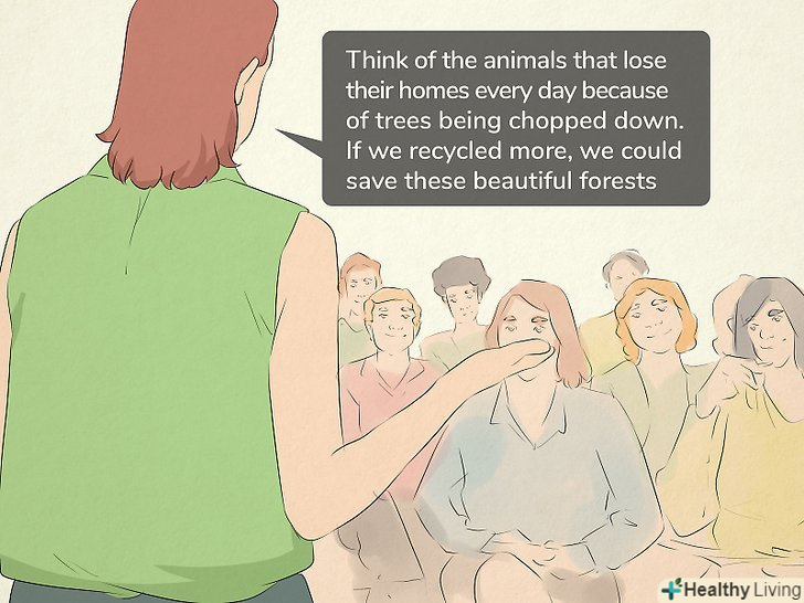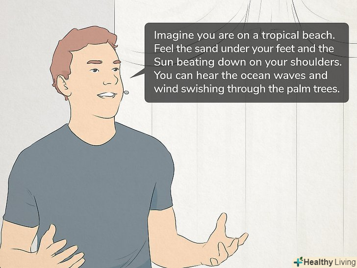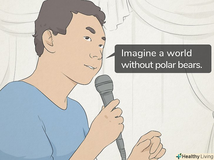 Попросіть глядачів щось уявити.Примусьте своїх глядачів пройти дуже короткий вправу з візуалізації, щоб надихнути їх фантазію, оскільки вона відноситься до вашої теми. Вони можуть не запам'ятати ваші слова настільки, наскільки запам'ятають картинки, що виникли в їх голові під час вашої мови. [8]- Наприклад, якщо ви виступаєте з промовою про замовлення путівки для ідеального відпочинку, то можете почати з: "уявіть, що ви на тропічному пляжі. Відчуйте пісок під ногами і сонце, що зігріває плечі. Ви чуєте хвилі океану і свист вітру крізь Пальми ".
