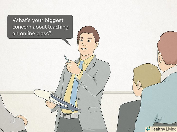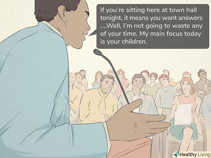 Отримайте пропозиції з залу для глядачів.коли люди слухають мову, то часто шукають відповіді на хвилюючі їх питання. Коли ви даєте публіці можливість задати питання в лоб, то це може допомогти сформувати вашу мову і переконатися, що Ви звертаєтеся до певних питань, які хвилюють публіку.- Якщо ви виступаєте з промовою, де обговорюється що краще онлайн-уроки або особисті уроки, то можете запитати: "що вас найбільше лякає в онлайн-уроках? "Дайте відповісти парочці людей, щоб почути їхні запитання. І є велика ймовірність, що ви тепер вже збираєтеся відповідати на них у своїй промові.[9]