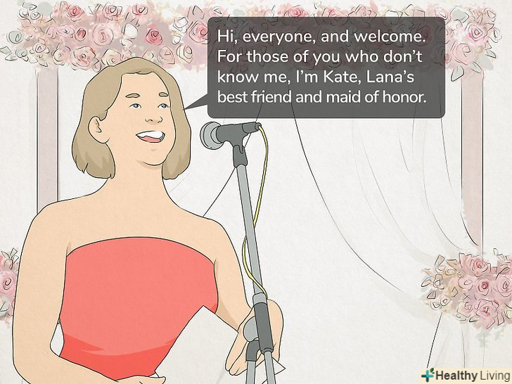 Розширте своє особисте привітання.у більш розважальних промовах ви можете використовувати більш розслаблений і неофіційний тон. Оратори часто представляються глядачам. У своєму поданні мовець повинен пояснити зв'язок між собою і темою на порядку денному і використовувати це пояснення в якості моста до вашої теми.[10]- Це найчастіше можна побачити в хвалебній промові і на весіллях. Мовець представляється і починає пояснювати, як він пов'язаний з людиною, до якого він звертається. Якщо ви говорите тост на весіллі, то можете почати з того, як ви пов'язані з нареченою, нареченим або в цілому парою новоспечених подружжя.
