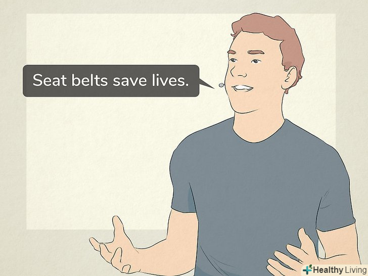 Зробіть шокуюче твердження.шокуюче твердження вразить глядача, і він захоче уважно слухати. Оскільки такі твердження часто викликають сильні емоції, то, сказавши щось таке на початку мови, ви зможете швидко залучити глядачів в тему.- Спробуйте сказати щось просте, щоб перейти ближче до справи, наприклад:"ремені безпеки рятують життя".