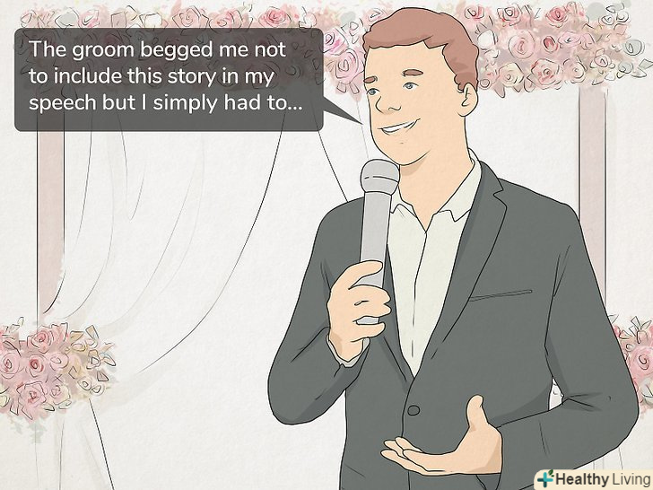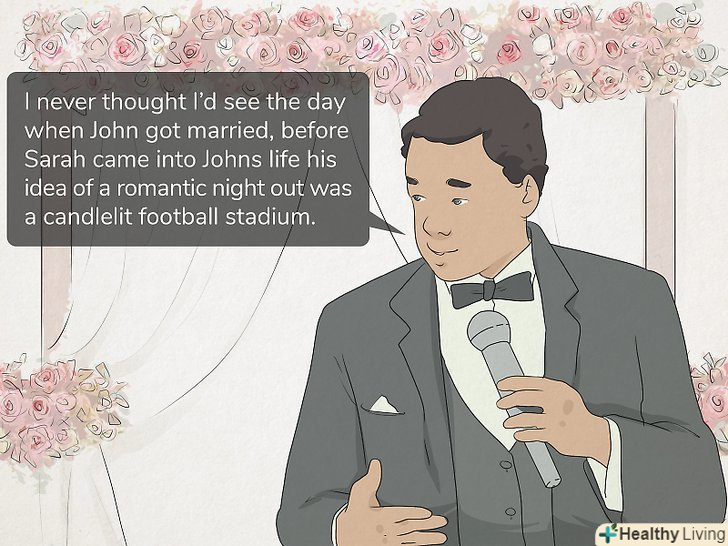 Почніть з жарту.якщо подія досить проста, то жарт або трохи гумору можуть стати прекрасним початком мови. Просто переконайтеся, що жарт нікого не образить в залі для глядачів.[1]- Можете розповісти забавну історію де були і ви, і ця людина на заході, що проходить на честь якоїсь конкретної людини. Просто не розповідайте якихось ганебних або образливих історій.