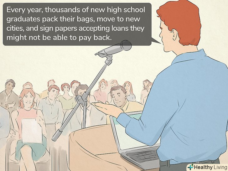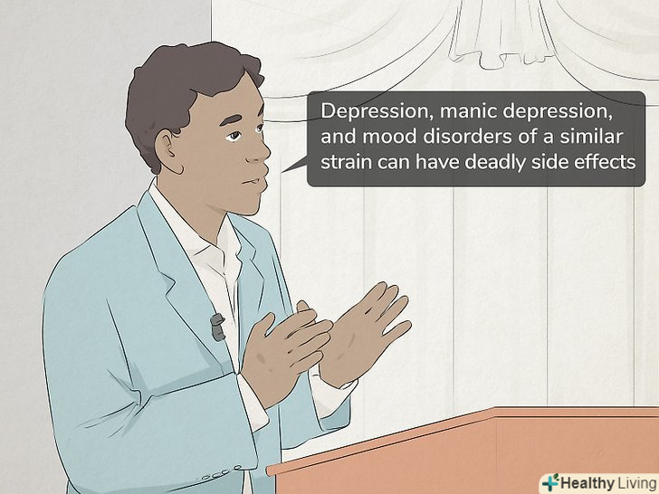 Зробіть нахабну офіційну заяву.безстрашна заява може шокувати або потрясти глядача, і він почне уважно слухати гадану йому серйозної тему.[3] ви можете також сказати, не використовуючи незрозумілих термінів, що глядачеві потрібно дізнатися інформацію, яку ви збираєтеся йому надати.- Якщо ваша мова йде про розлади настрою, то можете заявити щось в роді: "депресія, біполярний афективний розлад і розлади такого роду можуть викликати смертельні побічні ефекти ".