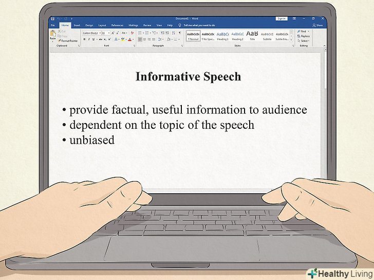 Щоб донести якусь інформацію, ваша мова повинна бути змістовною.змістовна мова зазвичай говорить про сутність і всього лише доносить інформацію, засновану на фактах. Вона корисна для слухача без власних міркувань на тему.[15]- Тон інформативної мови зазвичай досить гнучкий і часто залежить від теми. Наприклад, якщо мова про рак вимагає серйозного початку і серйозного тону, то історія винаходу йо-йо може бути цілком в простодушному Тоні.
