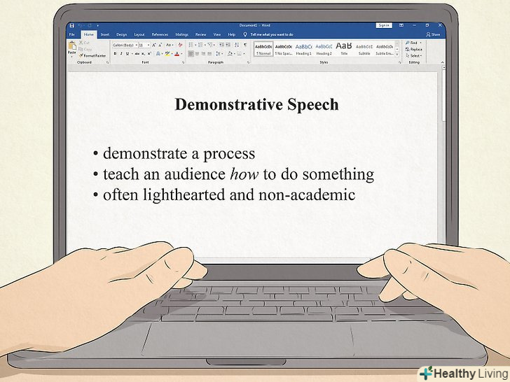 Використовуйте демонстративну мову, щоб пояснити процес.демонстративна мова загалом складена для навчання публіки " як " зробити щось, замість того, щоб просто розповідати про це.[16]- Демонстративна мова часто ведеться в простому, неакадемічному Тоні, так що початок такої мови завжди більш спокійне. До речі, якщо в кінці ви все ж перейдете до серйозної теми, наприклад, як вести себе під час урагану або торнадо, то вступ і в загальному вся мова повинна бути досить серйозною.