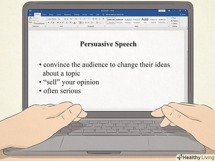 Переконливою промовою доведіть глядачеві щось.переконуюча мова прагне переконати глядача в зміні своїх ідей або ставлення до теми. Використовуйте відповідний тон.[17]- Цей тип мови може бути найскладнішим у виконанні, адже як оратор ви повинні досить залучати глядача, щоб" продати " свою думку.