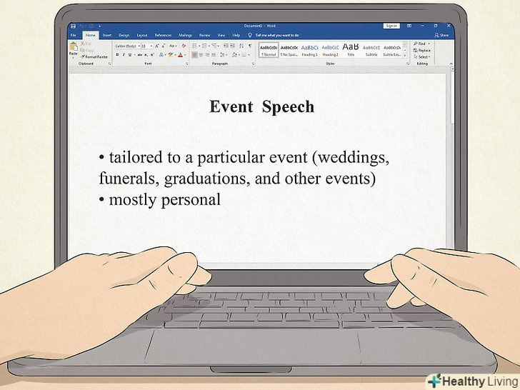 Мова на честь події.ця категорія мови покриває широкий спектр розмовних тонів і цілей, що включає мови для весіль, похоронів, випускних церемоній та інших. Ці промови фокусуються на цінності і якостях певних людей, які ви в своїй промові підкреслюєте. Підганяйте своє введення під настрій події.[18]- При серйозному або сумному подію зазвичай потрібно Похмурий або ностальгічний тон, але при святкових заходах необхідні розважальні або веселі вступу і мова. Наприклад, мова на чиєїсь весіллі повинна бути набагато безтурботніше, ніж хвалебна мова, і обидві вони будуть дуже особистими. Мова на випускному повинна бути досить узагальненою, щоб вона могла підходити всім випускникам.