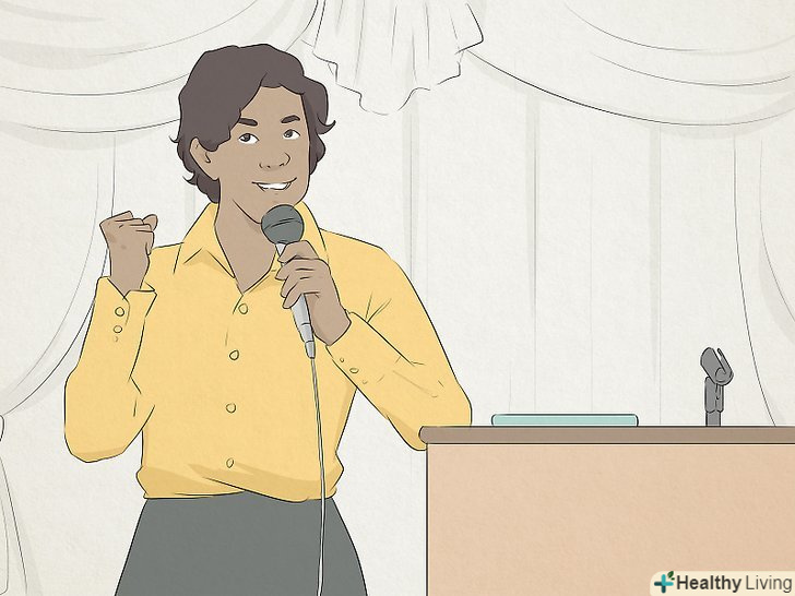 Нехай поруч стоїть стакан з водою.у багатьох людей пересихає в роті, коли вони говорять, так що обов'язково принесіть з собою воду. Прямо перед початком мови випийте маленький ковток.- Якщо будете виступати з короткою промовою, то, швидше за все, вам не знадобиться вода в середині мови. Якщо мова довша, то ви можете захотіти зупинитися і знову випити трохи води. Не потрібно відразу випивати всю воду, інакше можете намочити сорочку або закашлятися.