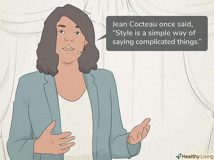 Підберіть відповідну цитату.змістовна або дотепна цитата, яка відноситься до теми мови може показати важливість твердження, і на ній можна побудувати основний зміст мови. Для надихаючої або розважальної промови про певну подію використовуйте цитати, якось пов'язані з Заходом або звертаються до глядача.[6]- Спробуйте вибрати цитату з добре відомих джерел, оскільки якщо вони дізнаються, хто її говорив, то, найімовірніше, відреагують.