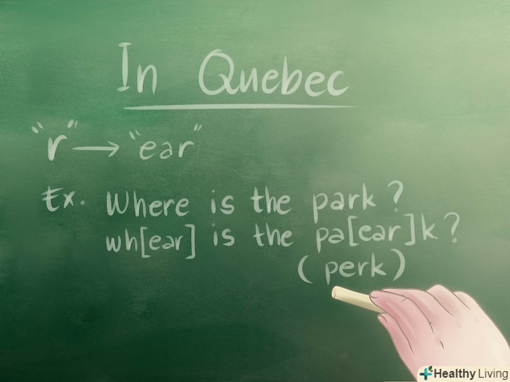- У провінції Квебек звук' r ' вимовляється як 'ear'. Наприклад ,у реченні ' Where is the park?', ви почуєте: 'where is the pa (ear)k (perk)?'