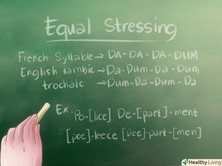 Рівний наголос. у французькій мові всі склади мають рівні наголоси (DA-DA-DA-DUM), в той час як в англійській мові ямбічна система (наголос чергується кожним другим складом, Da-DUM-da-DUM). Тому замість "po-[lice]' de-[part]'-ment", говорите " [poe]' - leece [dee]'-part-[men]'".