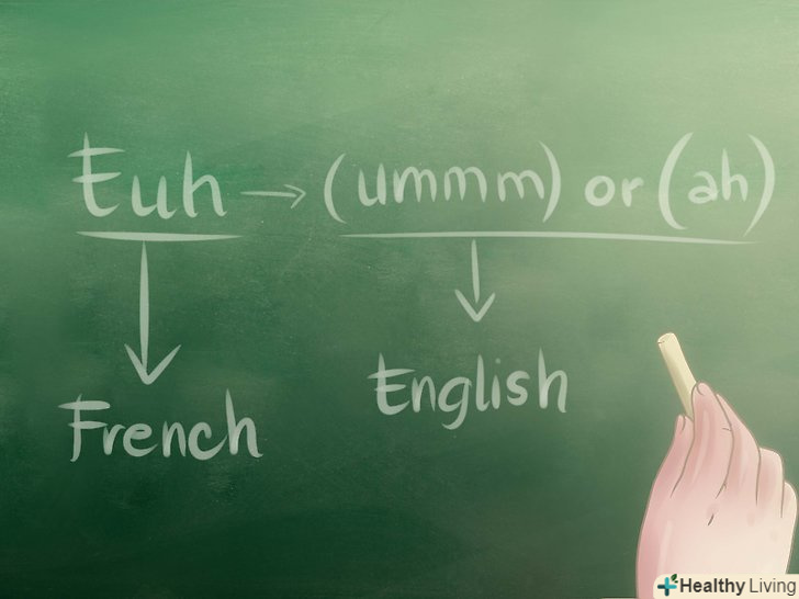 Euh. часто вставляйте межмометье "euh"s. "Euh" у французькій мові рівнозначно "Ummm" або "Ah..."в англійській. Воно показує задумливість людини перед тим, як щось сказати або відповісти. Вимовляється приблизно так само, як Пі пишеться. Розтягніть якомога сильніше "euuhhhhhh" і починайте пропозицію, як мінімум, з одного "euuhhhhhhhhhh". (Ніколи не кажіть "Ummm" або " Ah...", коли говорите по-французьки!)- Щоб краще вимовляти "euh", почніть зі звуку " eh "(як у слові "bed") і повільно переходите до звуку "oh" (як "so")але ніколи не вимовляєте його до кінця! Ви завжди повинні обривати фразу на півдорозі, щоб звук " oh " не звучав в повній мірі.