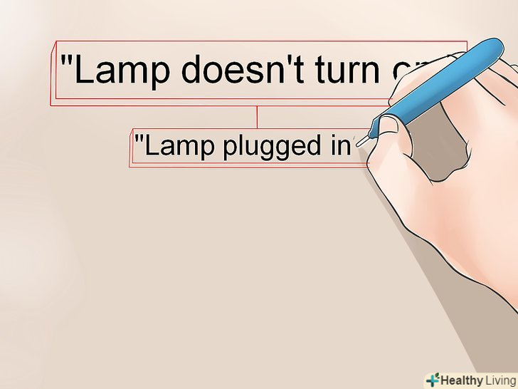 Виберіть відправну точку або проблему.Карта блок-схеми дозволяє вам розглянути сам процес і побачити безліч варіантів рішень. Схема потоків може бути лінійна і просто йти від одного концепту до іншого, також вона може включати безліч елементів для розгляду різноманітності розв'язок. Початкова точка може бути процесом або проблемою, яка вимагає рішення, для прикладу, нехай буде «Лампа не горить».[3]
