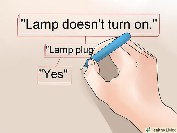 Запишіть висновки для наступного рішення.від питання " Лампочка перегоріла?"вам потрібно пустити гілки в два пункти" так»і "ні". Якщо відповідь на питання «Лампочка перегоріла» буде «так», вам потрібно з'єднати це слово з рішенням, «замінити лампочку». Ви завершили інший блок ідеї, тому що це рішення полагодить лампу. Але якщо виходить, що лампа не перегоріла, вам потрібно слідувати до відповіді «Ні» і до останнього варіанту: «полагодити лампу».- Тепер ви завершили блок ідеї для проблеми поламаної лампи, що привело вас до трьох рішень: увіткнути в розетку, замінити лампочку або полагодити лампу.