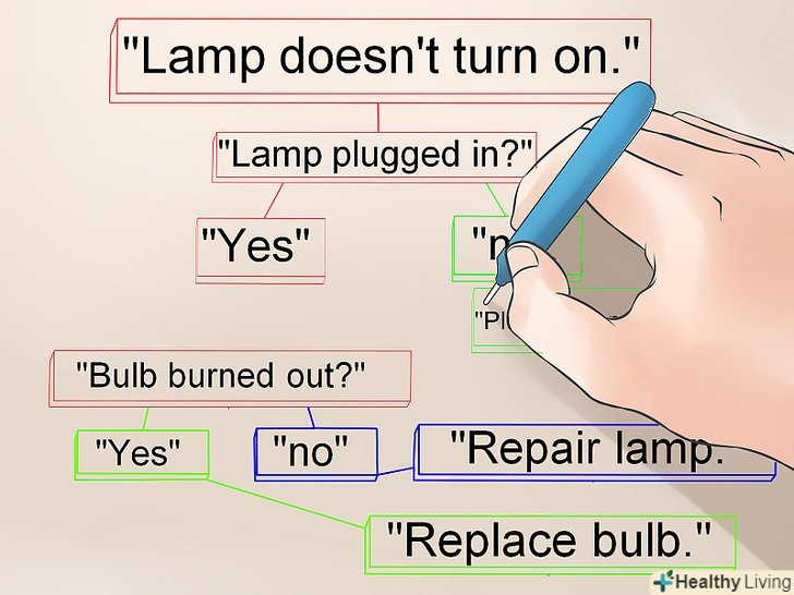 Напишіть найпростіший спосіб вирішення проблеми. для проблеми "Лампа не горить", типове рішення буде полягати в тому, що лампа не включена в розетку. Так і напишіть « " Лампа включена в розетку?", з'єднайте це стрілкою з "Лампа не горить".