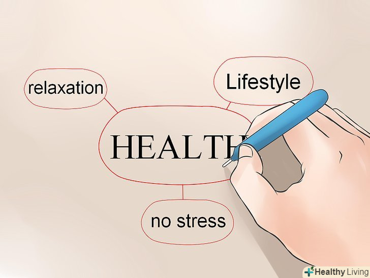 Напишіть підтеми навколо головної теми.тепер, коли ви записали основну тему, можете вписати підтеми навколо. Можете обвести їх в менші кружечки і зв'язати стрілочками з головною темою, «Здоров'я». Опрацюйте підтеми мозковим штурмом, перш ніж вибрати кілька з них – припустимо, три. Підтеми повинні бути досить об'ємними, щоб дати вам як мінімум по три додаткових деталі від кожної з них.- Припустимо, ви пропрацювали мозковим штурмом наступні поняття, споріднені здоров'ю: спосіб життя, релаксація, відсутність стресу, сон, здорові відносини, щастя, режим харчування, фрукти і овочі, вправи, авокадо, Масаж, Піші прогулянки, біг, розтяжка, їзда на велосипеді, три збалансованих прийому їжі, протеїни.