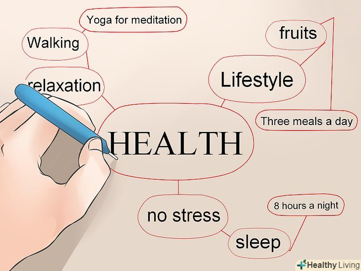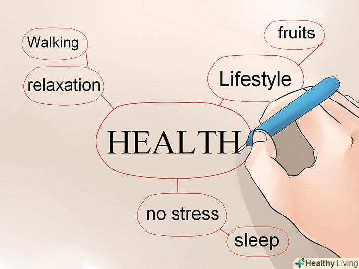 - Виберіть три найважливіші підтеми, які можуть включати багато з цих понять, і достатньо об'ємні, щоб об'єднати багато концепцій. З цього списку найбільш продуктивні терміни наступні: вправи, спосіб життя, режим харчування. Напишіть ці терміни в гуртках навколо основної теми і зв'яжіть їх лініями. Вони повинні якось рівномірно розташуватися навколо центральної теми»Здоров'я".