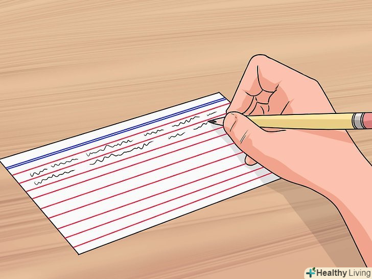 Зробіть флеш-картки.для запам'ятовування визначень слів, математичних формул або важливих дат можна використовувати флеш-картки, які легко зробити за допомогою звичайних листочків паперу. Ви можете переглядати їх, щоб швидко повторити матеріал. Крім того, виготовлення карток допоможе вам запам'ятати важливі моменти.[12]