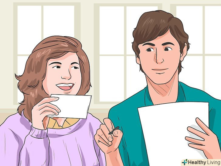 Виберіть друга, якому ви довіряєте.під час підготовки до іспиту у великій компанії друзів люди відволікають один одного, так що, швидше за все, ви не отримаєте очікуваної користі від таких занять. Однак промовляти досліджуваний матеріал вголос-дуже корисний спосіб запам'ятовування інформації. Якщо ви чуєте інформацію та обговорюєте її, ви, швидше за все, запам'ятаєте її.- Виберіть тільки одного друга, який налаштований серйозно займатися, а також здатний розуміти матеріал. Крім того, вам повинно бути комфортно з цією людиною, оскільки вам доведеться обговорювати з ним велику кількість інформації.[14]