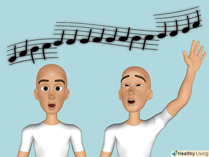 Використовуйте руки.коли ви відчуваєте, що Ваш голос наближається до бажаної ноті, допоможіть своїм тілом. Ви будете здивовані тим наскільки це ефективно.- Почніть співати при цьому розслабивши руки і опустивши їх уздовж тіла, коли ви перейдете на більш високі ноти робіть рукою круговий рух в повітрі (згадайте диригента) і чим вище виконувана нота, тим вище повинна бути рука.