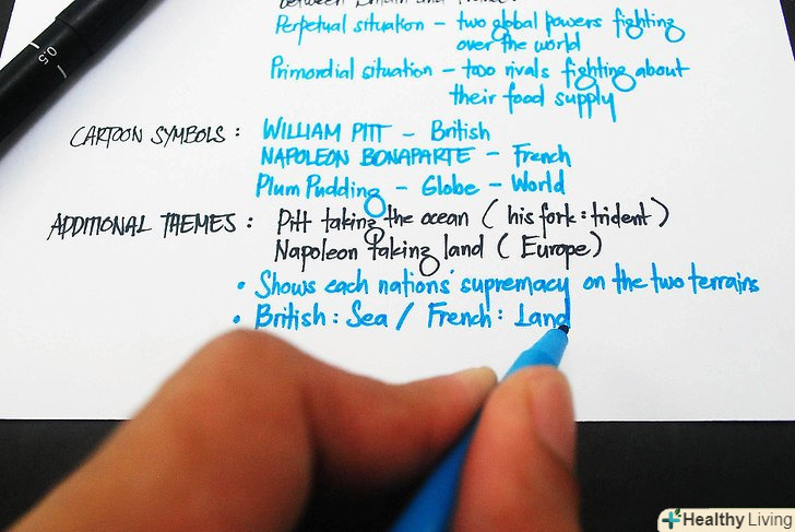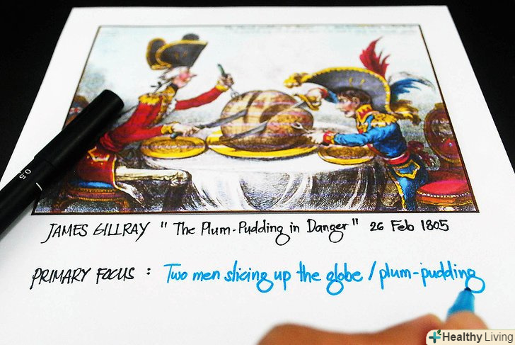 Придивіться до незначних деталей на карикатурі, які можуть додати елементи гумору або спотворення. дуже часто слова або схематичні позначення використовуються, щоб передати незначні теми або ідеї, які можна знайти на задньому плані або збоку зображення.
