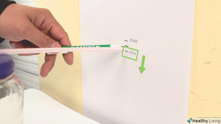 - Закріпіть біля покажчика невеликий листок щільного паперу.для зручності приклейте аркуш паперу до стіни і поставте банку так, щоб покажчик був спрямований на нього. Відзначте на аркуші поточне положення покажчика. Над цією відміткою напишіть "високе", а під нею — "низьке".[5]