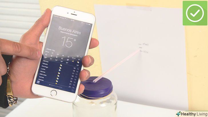 - Позначте поточний рівень води на зовнішній стінці пляшки.коли атмосферний тиск підвищиться, рівень води в пляшці впаде, а в трубці підніметься. І навпаки, при зменшенні атмосферного тиску вода підніметься в пляшці і опуститься в трубці.[13]