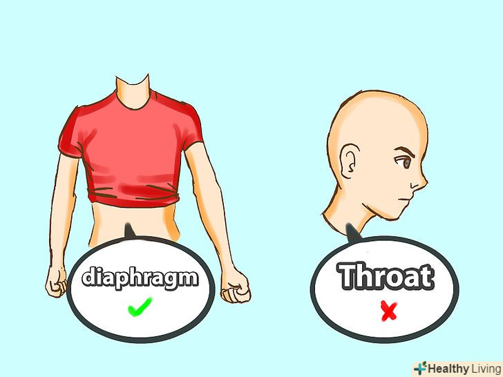 Сила співу виходить з діафрагми, але багато буквально намагаються видавити його з горла, що призводить до пошкодження зв'язок.- Щоб зміцнити діафрагму, робіть дихальні вправи.спробуйте лягати на спину з важким предметом на животі, піднімайте його якомога вище, вдихаючи і видихаючи. Потім почніть співати і постарайтеся утримати живіт на тому ж рівні, що на самому початку.