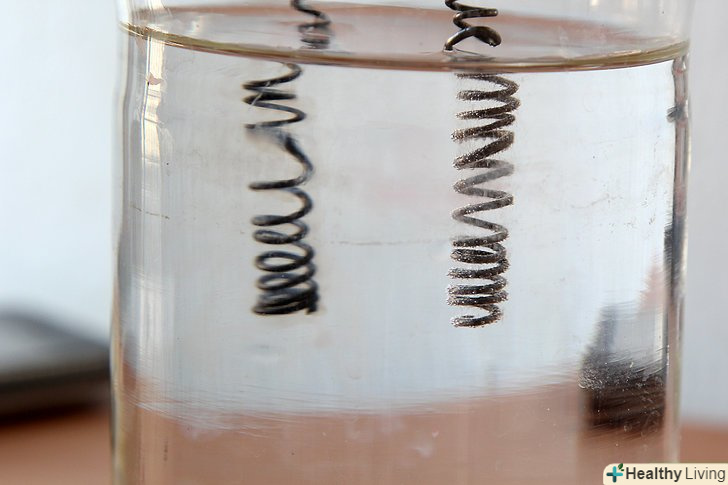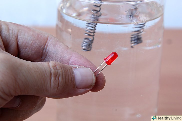 Налийте в стакан водопровідну або солону воду.для протікання реакції вода повинна містити електроліти.[7] для цього погано підходить дистильована вода, так як в ній немає домішок, які можуть послужити електролітами. Для нормального протікання хімічної реакції можна розчинити у воді сіль або харчову соду.- Мінеральні домішки містяться і в звичайній воді з-під крана, тому її можна використовувати в якості електроліту, якщо у вас немає під рукою солі.