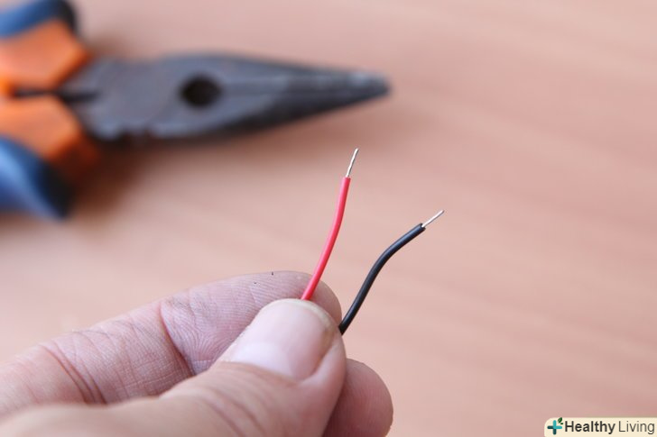 Розріжте навпіл дроти батарейного тримача.Візьміть кусачки, розріжте навпіл обидва прикріплені до тримача дроти і зніміть з них ізоляцію. Ці оголені дроти ви прикріпіть до електродів.- За допомогою відповідної частини кусачок очистіть кінці дроту від ізоляції. Зніміть ізоляцію з кінців тих проводів, які ви відрізали від батарейного тримача.