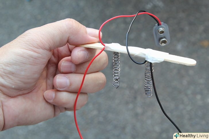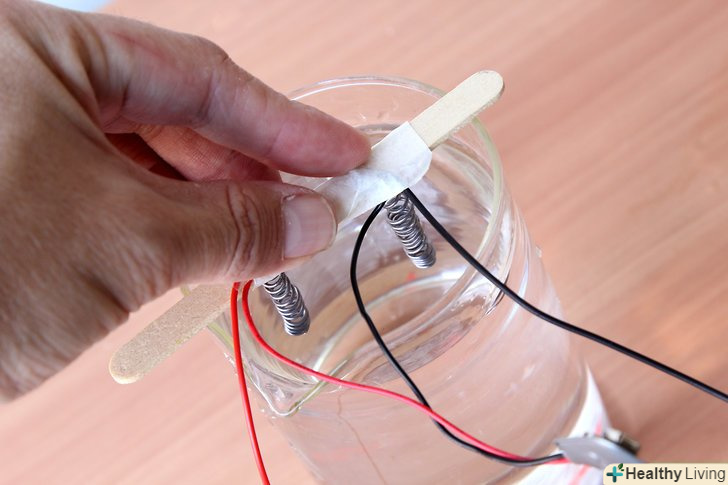 Прикріпіть електроди до палички для морозива або дерев'яного стрижня.паличка для морозива повинна бути довшою горлечка склянки з водою, щоб вона могла лягти поверх нього. Приклейте електроди так, щоб вони звисали з палички вниз і опускалися в воду.- Можна використовувати прозорий скотч або ізоляційну стрічку. Головне, щоб електроди були надійно прикріплені до палички.