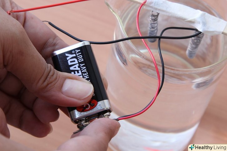 На 1-2 секунди доторкніться клемами 9-вольтової батарейки до батарейного тримача. Батарейка потрібна лише для того, щоб пропустити через дріт початковий струм, який викличе дисоціацію розташованих поблизу електродів молекул води, в результаті чого навколо електродів виділяться бульбашки газу.[8] цей процес називається електролізом.- Простежте, як біля обох електродів з'являються бульбашки газу. У одного електрода утворюються бульбашки водню, а у другого — кисню.