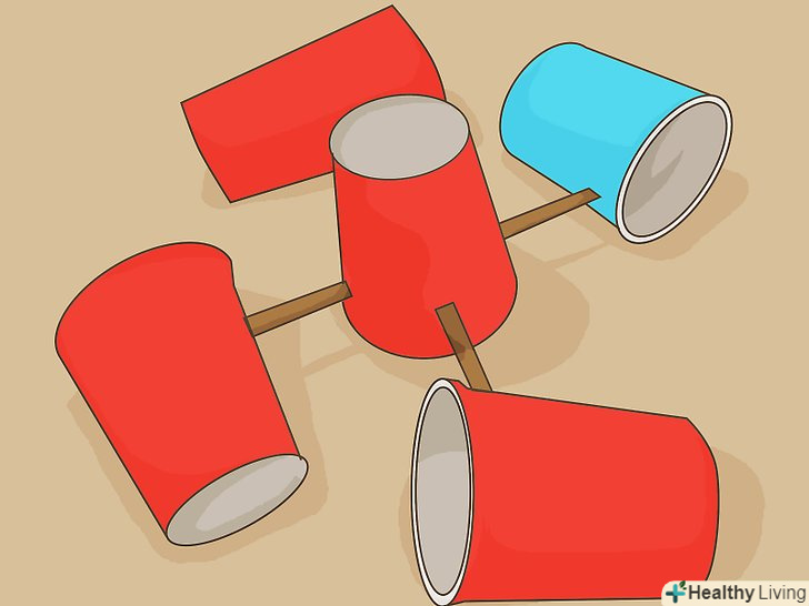 Прикріпіть до кінців картону чотири склянки.візьміть три склянки однакового кольору і один стакан іншого кольору і розмістіть їх на кінцях картонних смужок. Покладіть склянки на бік так, щоб їх дно було направлено в одну сторону щодо хреста з картону, і прикріпіть їх степлером до картону.