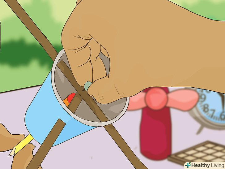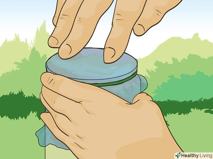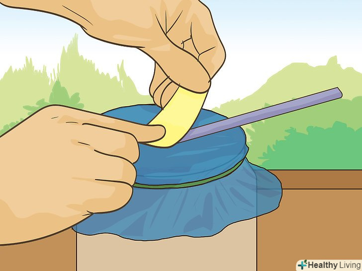 Накрийте банку з-під кави поліетиленовою плівкою.закріпіть плівку гумкою по краях, щоб вона не випускала повітря з банки.