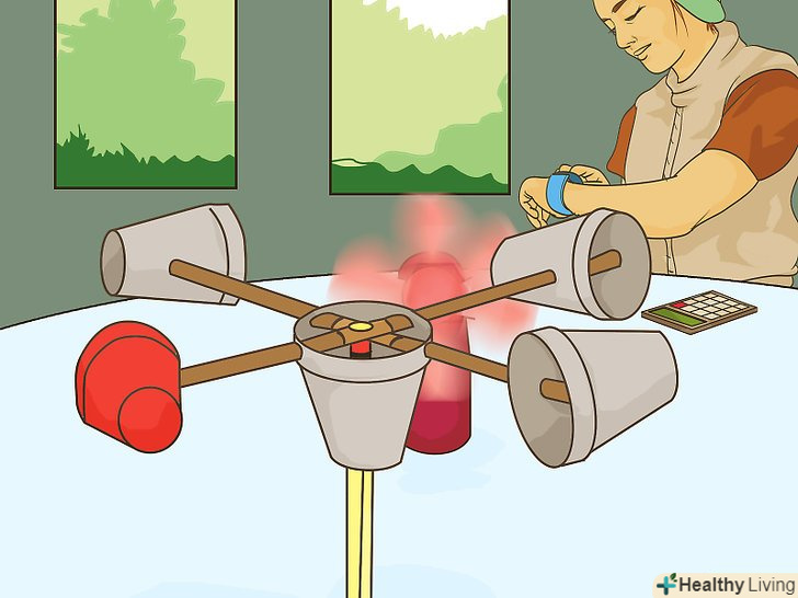 Поставте в 1-2 кроках від анемометра вентилятор.увімкніть його на малій швидкості. За допомогою секундоміра підрахуйте кількість обертів анемометра за 15 секунд. Помножте отриманий результат на чотири, щоб визначити число оборотів в хвилину.[8]- По склянці іншого кольору ви зможете визначати один повний оборот і точніше підраховувати число оборотів.