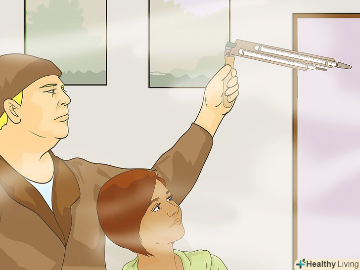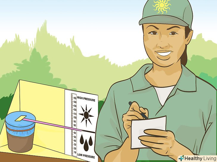 Дізнайтеся про призначення барометра.за допомогою барометра вимірюють зміни тиску повітря (зазвичай в мілібарах або міліметрах ртутного стовпа), що допомагає передбачити погоду. Тиск повітря є дуже важливим параметром, який використовують для метеорологічних прогнозів, проте повітря складається з найдрібніших молекул, які не видно неозброєним оком. Тиск виникає через те, що безперервно рухомі молекули газу тиснуть на певну площу. При стисненні повітря його тиск зростає, що вказує на зміну погоди.[2]- Якщо стовпчик ртуті або стрілка барометра піднімаються, це означає, що погода буде ясною і сухою. Якщо ж ртуть або стрілка опускаються, намічається похмура і дощова погода.[3]
