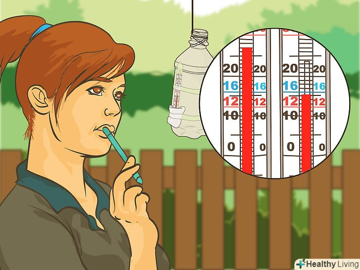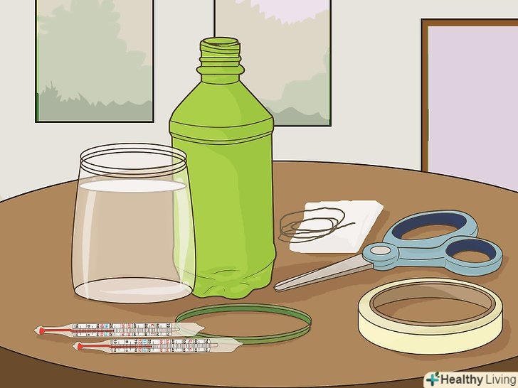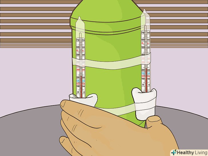 Прикріпіть термометри до пластикової пляшки.Візьміть термометр з марлею, розмістіть його з одного боку пластикової пляшки і закріпіть на місці скотчем.[13]- За допомогою скотча прикріпіть другий термометр до іншої сторони пляшки. Простежте, щоб вам було видно цифри і стовпчики спирту на термометрах.