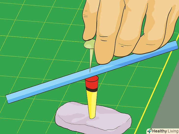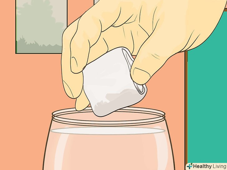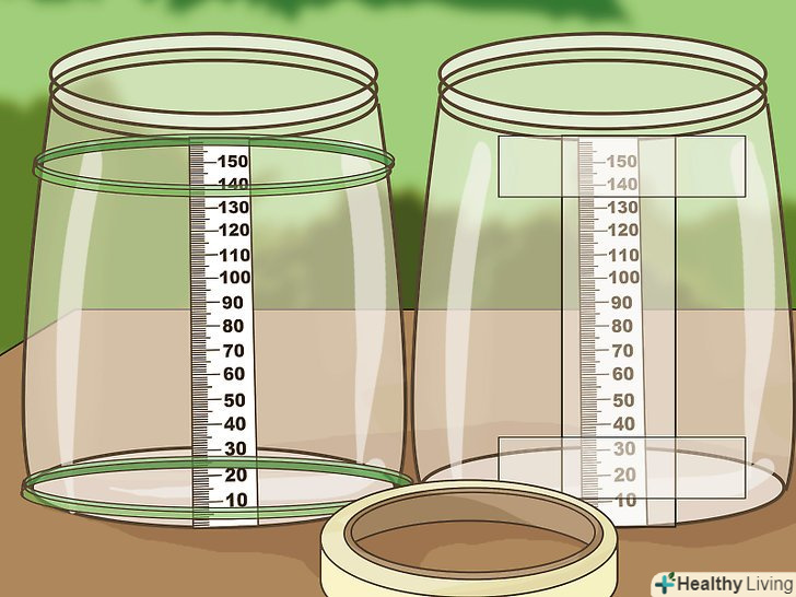 Прикріпіть лінійку до банку.лінійку можна прикріпити до зовнішньої сторони банки за допомогою гумки. Перевірте, щоб нижній кінець лінійки знаходився на одному рівні з дном банки, і ви добре бачили шкалу.[23]- Ще один варіант полягає в тому, щоб поставити лінійку вертикально в банку, так щоб її нижній кінець впирався в дно. При цьому вам повинна бути видна шкала лінійки крізь стінку банки.