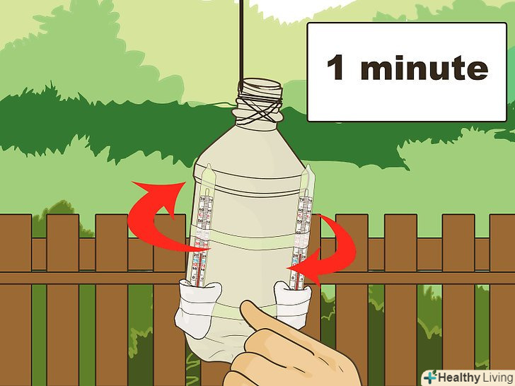 Прив'яжіть до шийки пляшки мотузку.надійно зав'яжіть її навколо горлечка-під час вимірювань вам доведеться розкручувати пляшку на мотузці.[14]- Міцно візьміться за вільний кінець мотузки і покрутіть пляшку по колу на відкритому просторі. Крутите пляшку протягом однієї хвилини. Після цього зніміть показання обох термометрів.